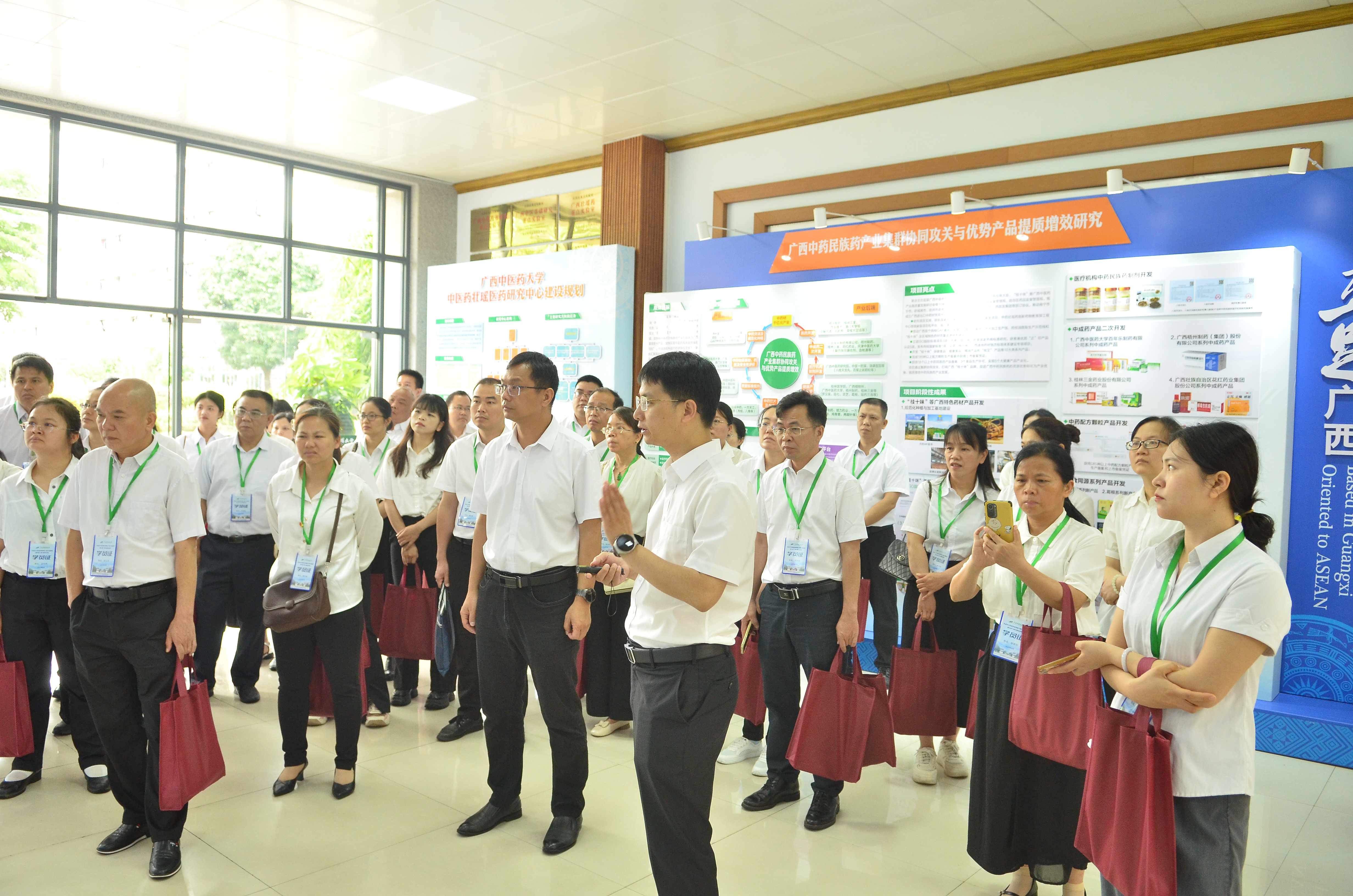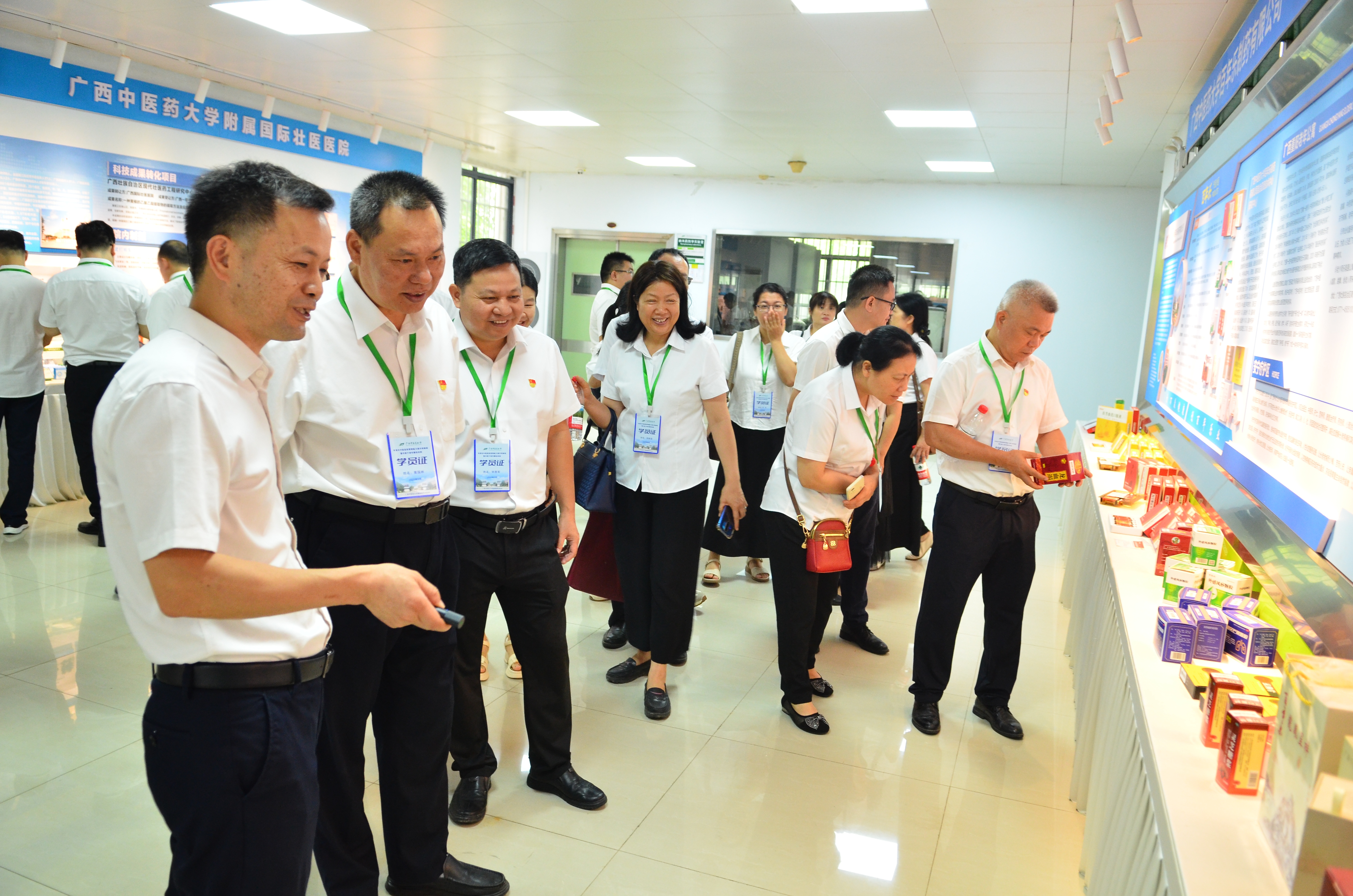 学校中医药壮瑶医药研究院院长王孝勋,副院长高红伟在研究院一楼展厅为学员们详实介绍研究院的发展脉络与突破性成就。在学校及附属医院、百年乐制药有限公司、重阳城老年公寓等展区,直观展现了产、学、研、养结合的“中医药+”生态链,为学员们在未来科研方向与医院产业延伸方面提供了可借鉴的生动样本。