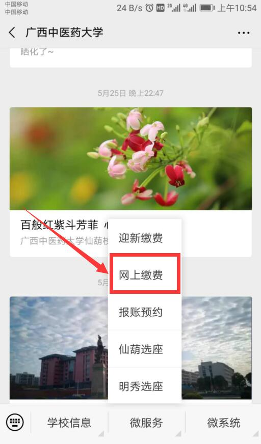 2.进入微信公众号“微服务”-“网上缴费”