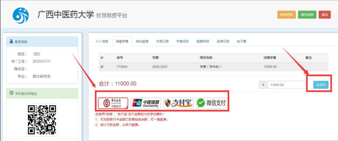 微信支付请点选“微信支付”;支付宝支付请点选“支付宝”;中国银行卡缴费请点选“中银快付”, 使用其他银行卡缴费请点选“中国银联”进行网上在线支付,见下图:
