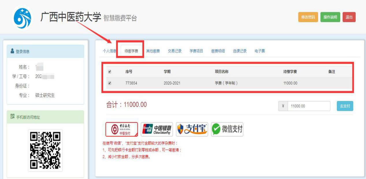 点击“待缴学费”标签。该表列有项目名称、待缴学费等信息,见下图: