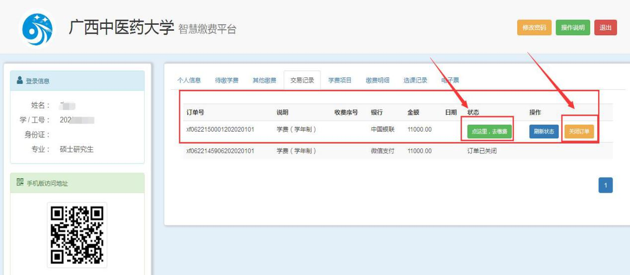 2.如果点击“去支付”未出现支付页面,请点击“交易记录”-“点这里,去缴费”进入支付页面;或点击“关闭订单”,重新提交新订单支付。