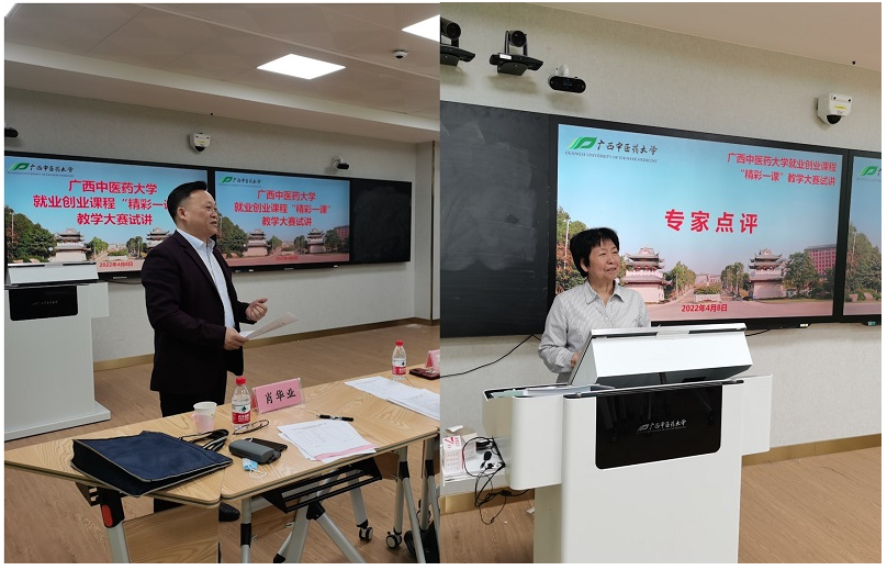 4月8日上午,全区高校教师就业创业课程“精彩一课”教学大赛校级选拔赛在明秀校区时珍楼举行,大赛由招生与就业处、创新创业学院(合署)处长、院长(兼)肖华业主持,学校督导陈雪斌、壮医药学院党委书记张煜、学生工作处副处长吴健文担任评委。