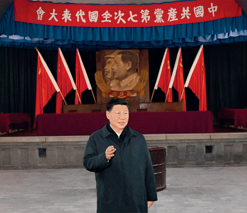 2022年10月27日,中共中央总书记、国家主席、中央军委主席习近平带领中共中央政治局常委李强、赵乐际、王沪宁、蔡奇、丁薛祥、李希,瞻仰延安革命纪念地。这是习近平在杨家岭瞻仰中共七大会址。新华社记者 燕雁/摄