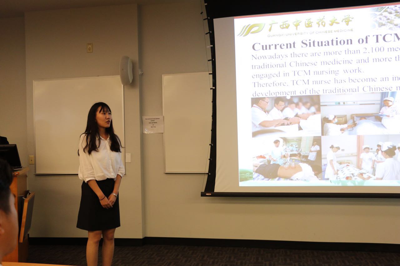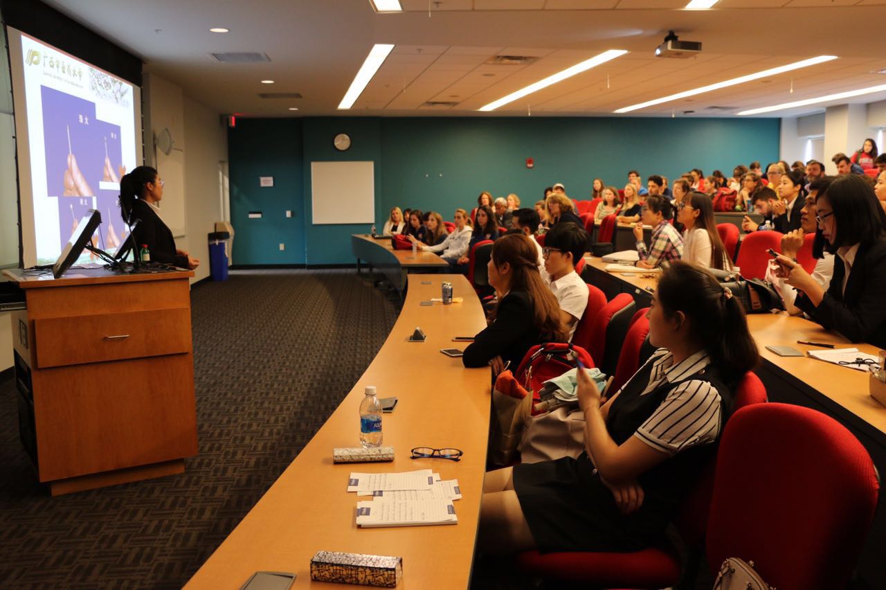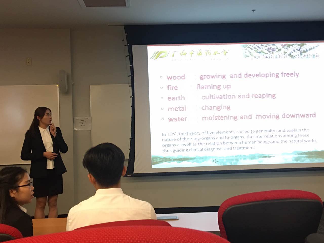 美国纽约当地时间7月26日下午15时,taptap点点体育赴美校际访学交流团的18名交流学生在美国督优维尔学院学术报告厅顺利地完成了以中医药为主题的英文演讲和展示,他们向美国姐妹校的师生们展示了点点体育师生风采和中医药的魅力。美国督优维尔学院学术副院长阿鲁普辛博士、部分师生以及在校短期交流学习的意大利留学生出席了此次讲座,整个报告厅座无虚席,现场气氛热烈。点点体育国际教育学院陈婧怡老师和护理学院柳琳琳老师作为带队老师为此次讲座进行了精心的准备和现场指导。