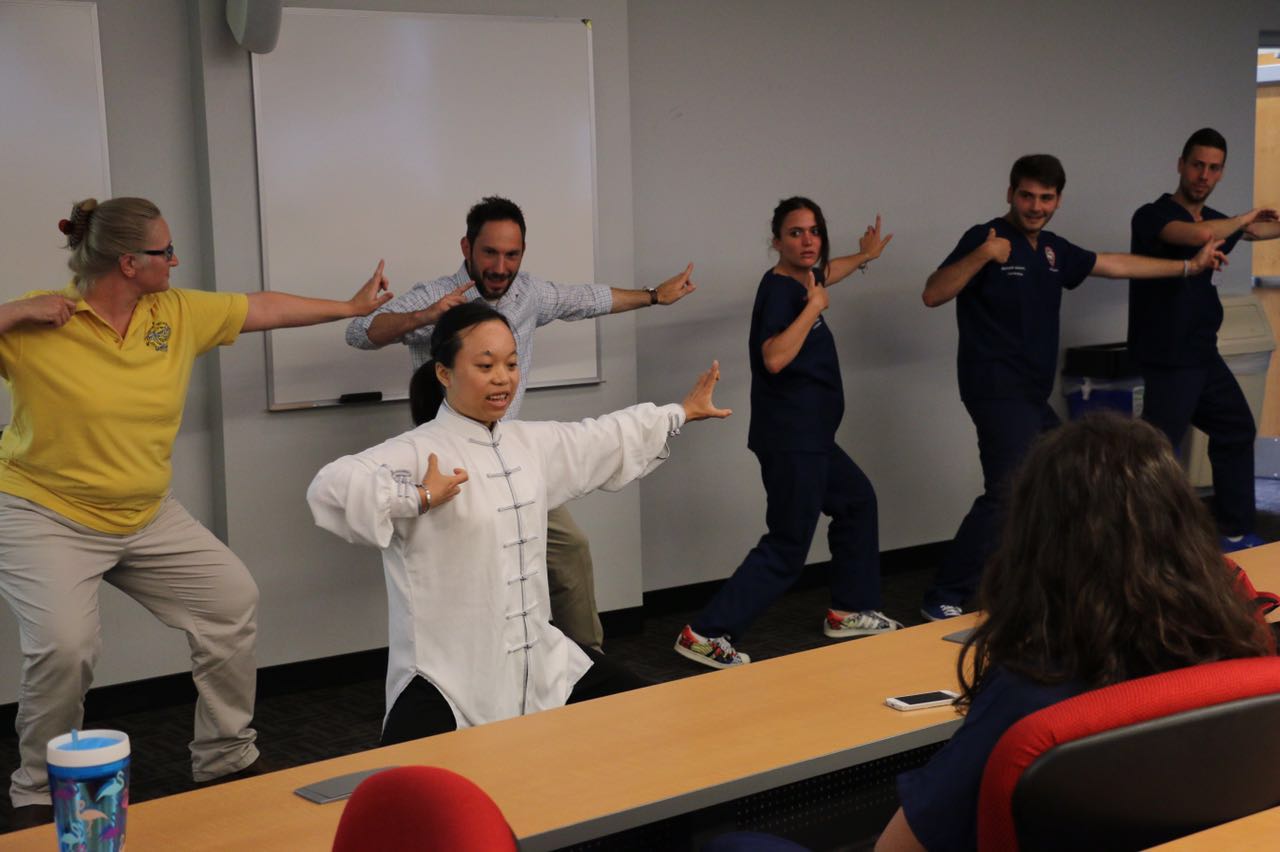 在讲座的过程中,点点体育交流学生用流利的英语为现场观众演讲和展示了中医药诸多方面内容,其中包括中医阴阳五行理论、中医推拿、天灸疗法、拔罐疗法、壮医药线点灸、中医养生导引术(八段锦)、中医康复、中西医结合治疗鼻咽癌、中医护理及其方法等相关主题。同学们用生动的实操展示和真人演示征服了观众,现场多次爆发出掌声和惊叹声。演讲结束后,美国同学还意犹未尽地在报告厅跟住中国同学们打起了中国传统功法-八段锦,互动现场达到了高潮。