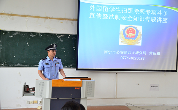 首先,南宁市公安局出入境管理分局三大队大队长梁毅和梁爱晶警官就外国人签证类型,非法滞留等留学生关心的出入境相关法律法规做了详细的讲解。特别强调在校留学生不得非法居住或就业、注意自己签证的有效时限,避免因疏忽发生非法居留的违法行为。接着南宁市公安局西乡塘分局人口大队副队长黄绍相警官在讲座中强调,在华留学生必须遵守中国法律法规,不得有危害中国国家安全、损害社会公共利益和破坏社会公共秩序的行为,并就贩毒吸毒、打架斗殴、偷盗财物,违规持有非机动车牌照等违法犯罪行为的判定和处罚措施进行了详细生动的讲解。接着学校保卫处陆会林副处长发言,希望留学生务必遵守学校各项规章制度,特别要求提高防火安全意识,注意电单车的校内驾驶和停放以及注意排除宿舍的违规电器安全隐患等。
