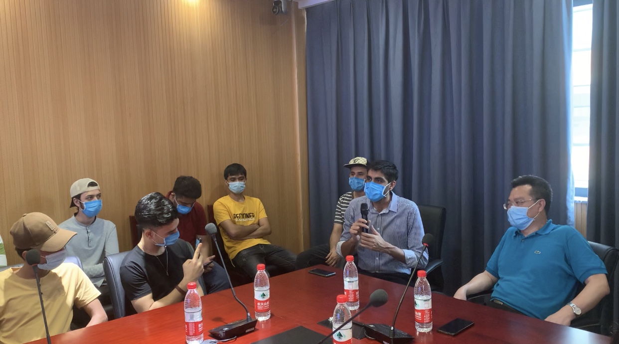 2020年5月19日早上八点半,国际教育学院院长蒋基昌、副院长韦文朗与全体 在校 巴基斯坦 籍留学生在留学生公寓楼三楼会议室 进行 了一次别开生面的 座谈, 大家 共同学习 了 中共党中央习近平总书记 在5月17日 给北京科技大学全体巴基斯坦留学生的回信。