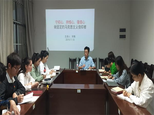 会议第三项,支部书记宋南主持开展了“守初心,持恒心,强信心--做坚定的马克思主义信仰者”的主题党课,从什么是初心、为什么信仰马克思主义的方面,让学生党员深刻学习了马克思主义并明确自己的初心。