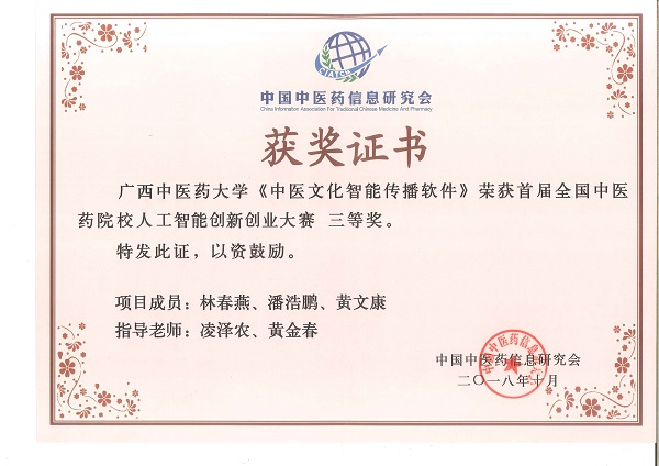 首届全国中医药院校人工智能创新创业大赛中荣获三等奖