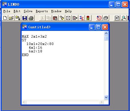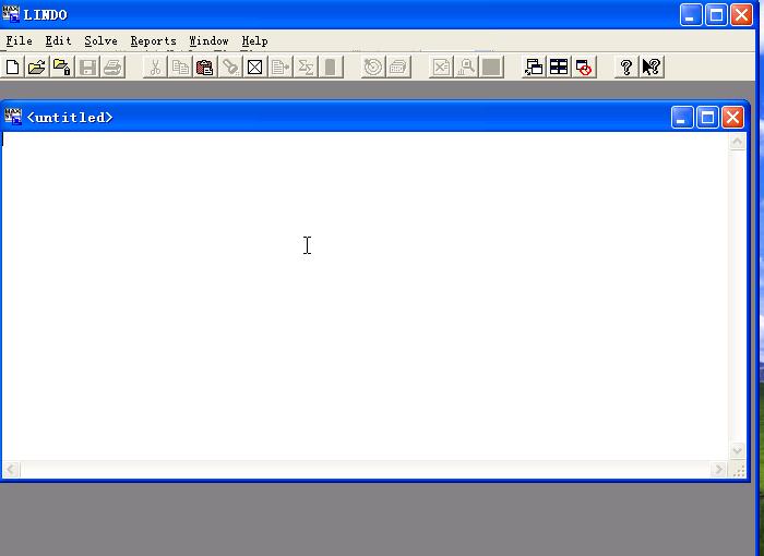 外面的标记有“LINDO”的窗口是主窗口。所有其它窗口将包含在这个窗口内。主窗口还包含所有的命令菜单和命令工具栏。6个主要菜单类:File(文件)菜单、Edit(编辑)菜单、Solve(求解)菜单、Reports(报告)菜单、Window(窗口)菜单)、Help(帮助)菜单。标记有“untitled”的较小的子窗口是一个新的、空白的模型窗口。我们将在这个窗口直接输入示例模型。