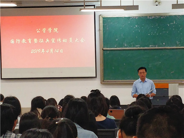 为加强大学生应征入伍政策的宣传教育力度,积极响应学校2019年征兵宣传和动员工作,激发在校大学生参军热情,公管学院于4月14日下午在仙葫校区举行了国防教育征兵宣传大会,学生工作办公室主任宋南对全院学生进行了国防教育和参军动员。