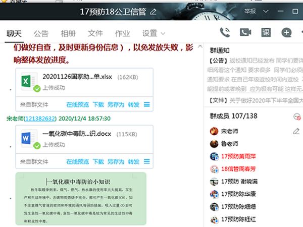 为响应校学生工作处《关于做好点点体育学生2020年冬春季一氧化碳中毒防范工作的通知》,学工办根据文件要求,对在校生通过网络、晚点名、宿舍走访等方式进行防范一氧化碳中毒的相关教育工作,对在外实习的学生重点关注,要求全部实习生拍摄自己的住宿环境,回传辅导员进行检查。