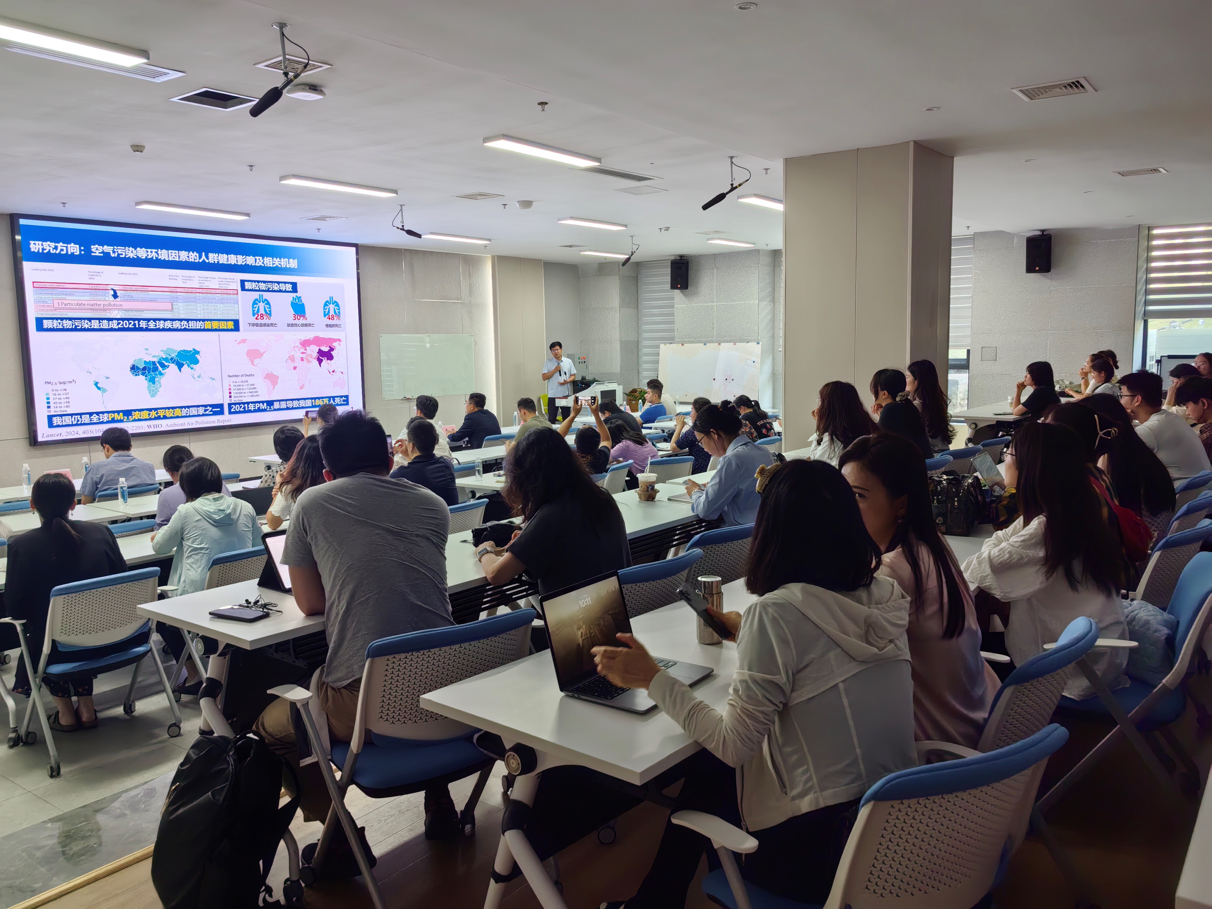 田耀华教授及其团队做了题为“大气污染的人群健康效应研究”及“常用医学数据库介绍”两个报告。田教授以大气污染的人群健康效应研究为例,介绍了数据常用的分析方法,模型构建思路,结果解释与应用。田耀华教授的博士生马玉迪阳同学为我们介绍了全球疾病负担(GBD)数据库、英国生物银行(UK Biobank)、中国健康与营养调查数据库等常用医学数据库,内容包括数据访问及下载方式,初级、进阶、高级的统计学方法,数据库的分析思路并列举了一些成功案例。