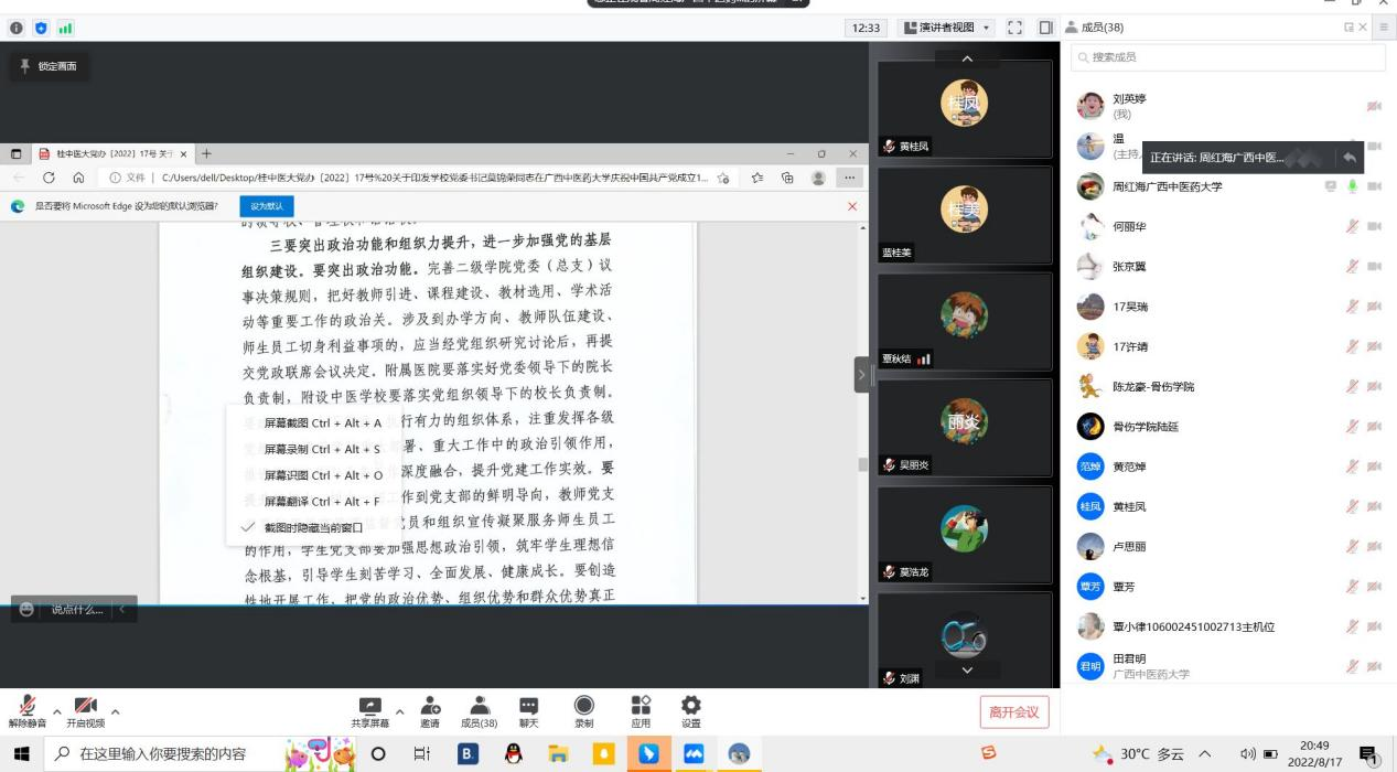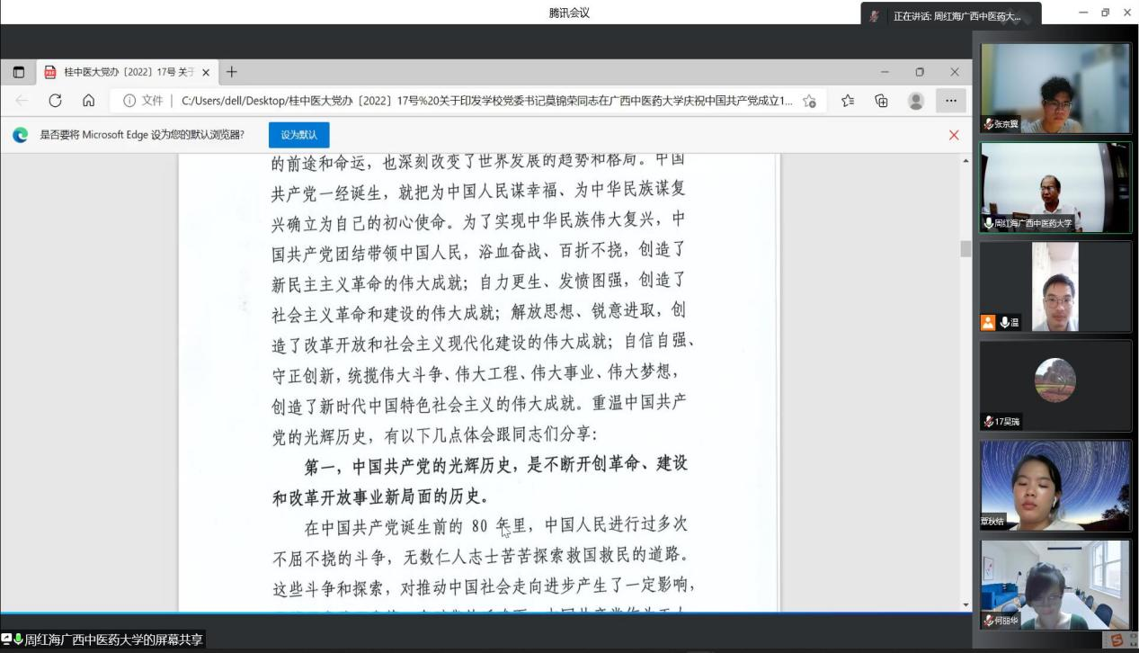8月17日晚20:30,骨伤学院党支部以视频会议的方式,召开了支部党员大会。由于暑假期间,师生党员分散各地,为了更好学习、传达、落实学校党委莫书记在taptap点点体育庆祝中国共产党成立101周年座谈会上的讲话内容,我支部特召开本次线上视频会议。会议由骨伤学院党支部周红海书记主持,全体师生共39名党员参加了本次会议。