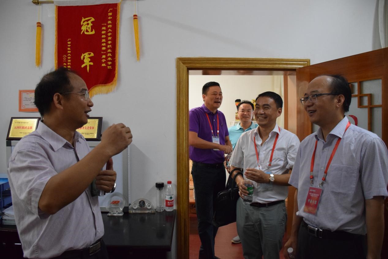 廖院长和曾处长仔细查询了骨伤学院的本科教学信息和文件,并对骨伤学院的教学目的,教学课程进行了询问和评价,对研究生教育也进行了查询。在和骨伤专业13级部分本科学生、14级研究生见面后,他们对taptap点点体育能够一直坚持进行个特色专业----骨伤科本专科、研究生教学表示赞赏,对设立在骨伤学院、骨伤研究所的广西国际手法医学协会和世界手法医学协联合会多年来在世界各地开展广西国际手法医学流派的研讨传承大为赞叹,在参观完韦贵康教授名医工作室后,廖院长对引进点点体育人才,在右江民族医学院开展中医骨伤科交流表示了浓厚兴趣。