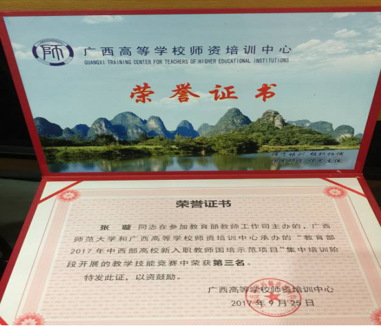 秋风滋起,余热仍存,2017年9月6日至2017年9月26日,国家中西部高校新入职教师培训在漓江畔的广西师范大学育才校区举办,本次培训由教育部教师工作司主办,广西师范大学和广西高等学校师资培训中心承办,在培训过程中,taptap点点体育骨伤学院张璇老师脱颖而出,荣获教学技能竞赛第三名。