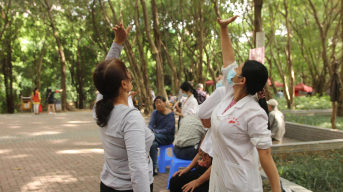 志愿者教居民“八段锦”动作