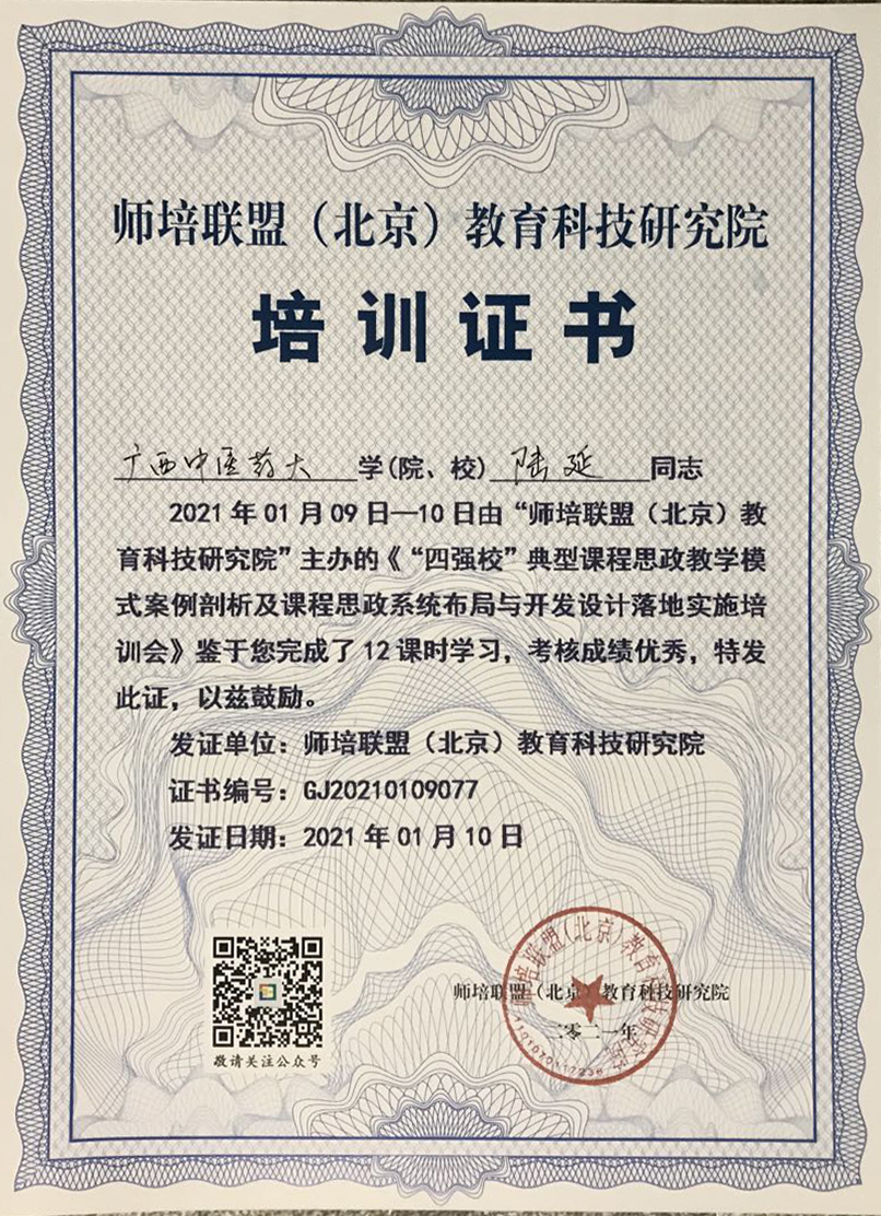 2021年1月9日-10日,taptap点点体育骨伤学院教师刘渊副教授和陆延讲师在南宁参加了由师培联盟(北京)教育科技研究院组织的“四强校”典型课程思政教学模式案例剖析及课程思政系统布局与开发设计落地实施培训会。