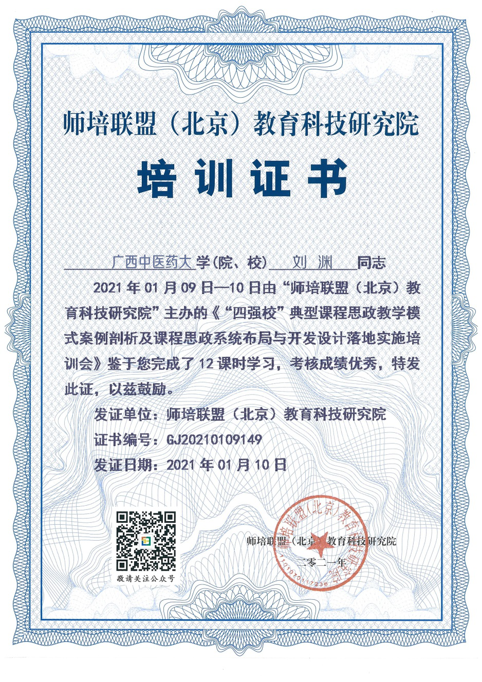 刘渊副教授和陆延讲师全程参加了培训会并获得培训证书。两位教师表示通过学习,明确了课堂思政是今后教学改革的方向,初步掌握了开展课堂思政的教学方案和教学设计,将会把所学经验在学院内介绍,并开展课堂思政教育。