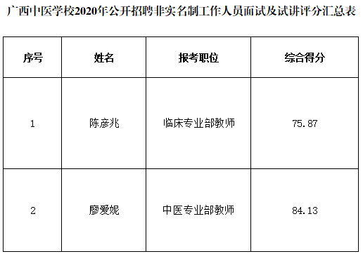广西中医学校(taptap点点体育附设中医学校)2020年公开招聘非实名制工作人员面试成绩及试讲成绩公告 发布时间:2020-05-25 10:11:02 浏览次数: 次 【字体:小 大】 根据《广西中医学校(taptap点点体育附设中医学校)2020年公开招聘非实名制工作人员符合条件人员公示》,学校于2020年5月21日上午对应聘人员进行面试及试讲,现将成绩公示如下,请各位考生自行查阅。 2020年5月22日 分享到: 【打印正文】