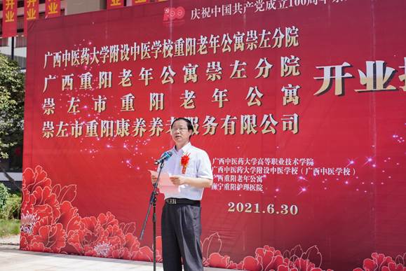 戴副校长说:在即将迎来中国共产党百年华诞的重大时刻,在全国上下深入开展“学党史、悟思想、办实事、开新局”的热潮中,我们迎来了附设中医学校重阳老年公寓崇左分院、崇左市重阳老年公寓的开业庆典,这是附设中医学校发展史上的一大盛事,也是我们学党史、办实事的一个重要体现。他还说:附设中医学校重阳老年公寓是广西乃至全国首家由专业院校经营的大型养老机构。历经十八年的创业发展,旗下拥有重阳老年公寓总部、石柱岭分院、菠萝岭分院、万力分院、龙腾分院。今天开业的崇左分院是直属第五家分院。它将依托学校、重阳总部的技术、人才、科研的优势和专业的技术队伍,遵循一切围绕“以长者为中心,秉承养护医、产教研”的宗旨提供各项周到的服务。