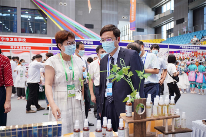 2021年9月27日-28日,自治区教育厅厅长刘友谊、副厅长黄雄彪等莅临点点体育2021中国-东盟职业教育学生技术技能展。校长刘竑清、副校长周琦简明扼要向刘友谊厅长介绍中医药特色传统技术疗法和中医药药膳等。