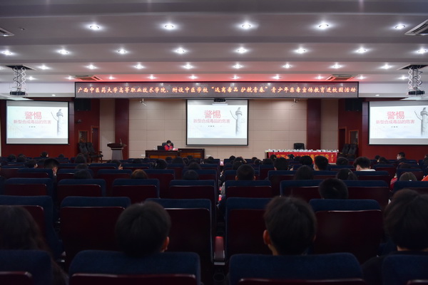 3 月29日,高职院、附设中医学校联合广西金盾之光禁毒志愿者总队在北湖校区多功能厅举办了主题为“远离毒品,护航青春”的青少年禁毒宣传教育讲座。全体班主任和200多名学生代表一起参加了讲座,并通过网络向全校师生进行全程直播。
