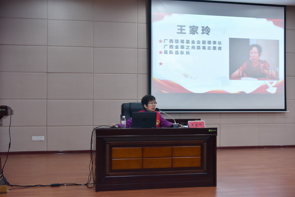 广西金盾之光禁毒志愿者总队王家玲总队长通过多媒体课件向同学们介绍了毒品的种类、毒品对自身和家庭的危害,同时,结合真实案例分析、互动问答的方式,激发了学生学习禁毒知识的兴趣;结合仿真毒品模型向青少年详细介绍了传统毒品与新型毒品的种类与区别,进一步加深青少年对毒品的认识和了解。