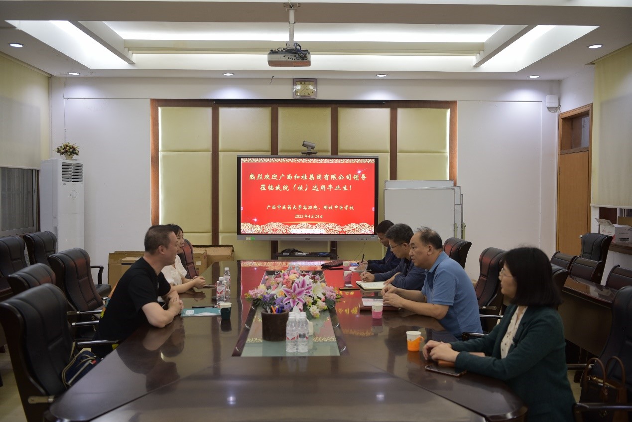 4月24日下午,广西和桂集团有限公司领导一行到访高职院、附设中医学校东葛校区,就校企合作相关事宜在一楼会议室开展座谈交流。院(校)长刘竑清、党委副书记、副院(校)长刘武及相关部门负责人参加座谈会。
