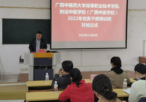 为深入学习贯彻党的二十大精神,加强基层党组织标准化规范化建设,提高新任党务干部业务素质和工作能力,12月2日-12月4日,高职院、附设中医学校党委在明秀校区基础楼西梯三教室举办学习贯彻党的二十大精神暨2022年党务干部专题培训班,高职院、附设中医学校新一届全体党支部委员参加此次培训班。
