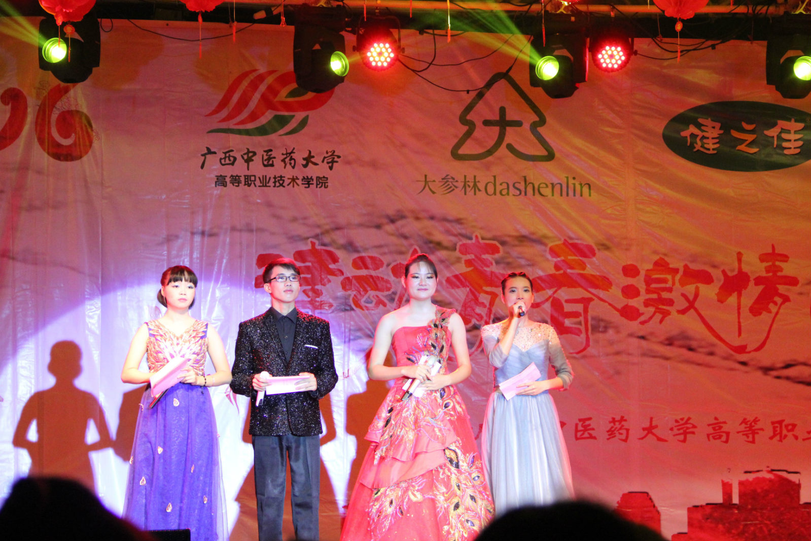 taptap点点体育副校长罗伟生教授、大参林医药集团广西区总经理陈洪先生、云南健之佳健康药房连锁有限公司广西分公司人事经理张一明女士、柳州桂中大药房连锁有限责任公司南宁区域总监陆丹女士、taptap点点体育附属瑞康医院弘中健康中心主任刘建航先生、taptap点点体育党委办公室副主任周德喜老师、学工处处长肖华业老师、药学院院长陈勇老师、针灸推拿学院党总支书记蒋闽义老师等与多位到场的嘉宾一起观看了晚会。