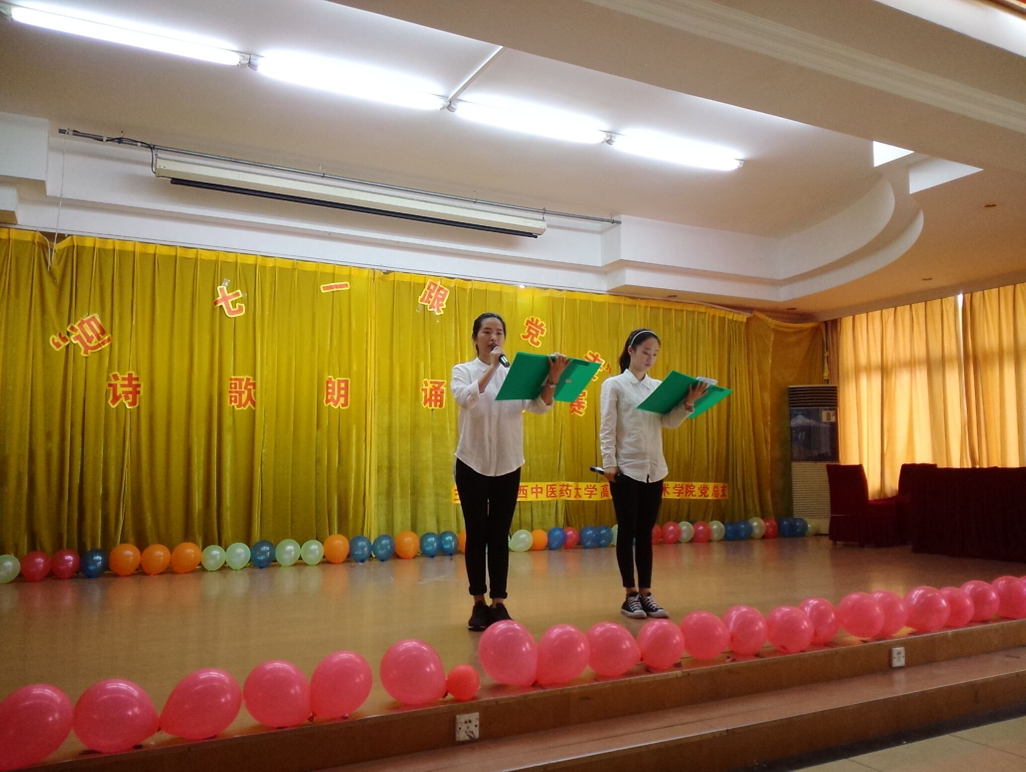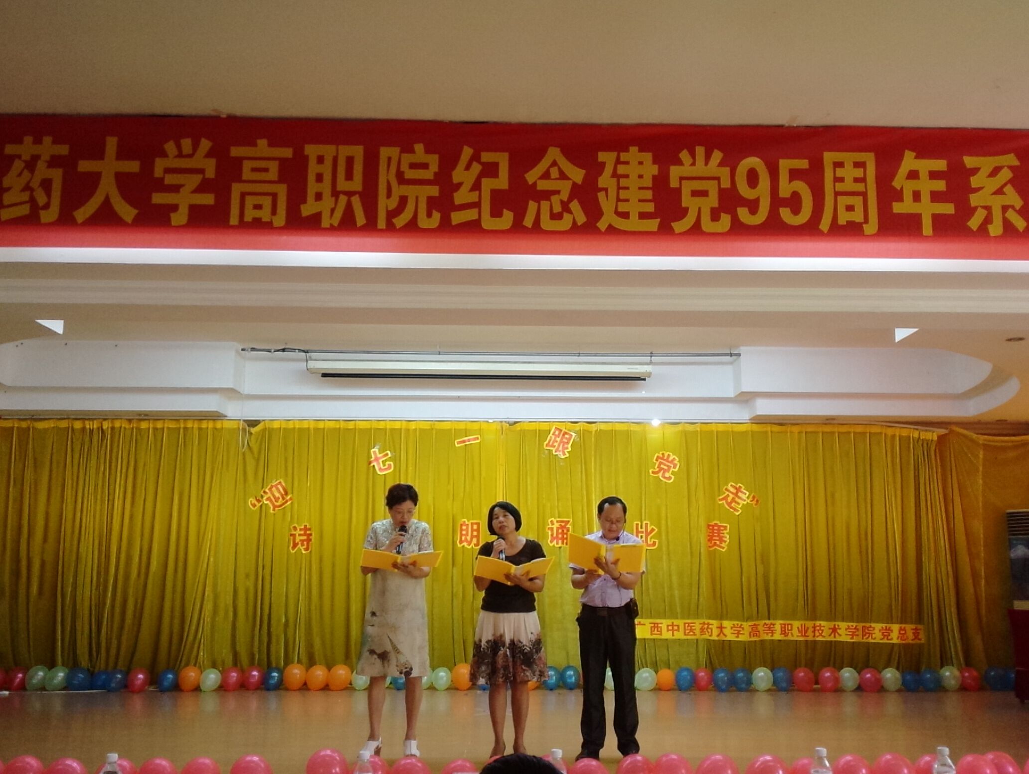 为纪念建党95周年,结合“两学一做”学习教育,弘扬中国共产党的丰功伟绩,展示高职院广大党员的精神风貌,高职院党总支于2016年6月17日下午在明秀校区大俱部成功举办了主题为“迎七一 跟党走”的诗歌朗诵比赛,taptap点点体育高职院党总支书记、院长邓远美,高职院党总支副书记、副院长周琦,高职院副院长杨仕权以及高职院全体教工党员及入党积极分子出席了本次活动。