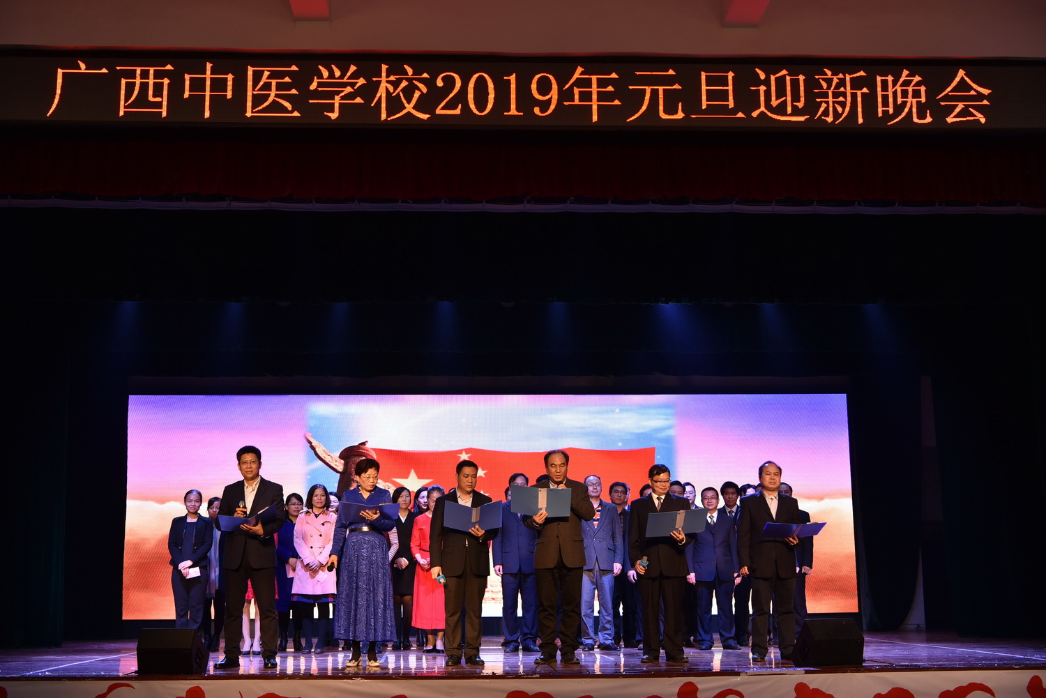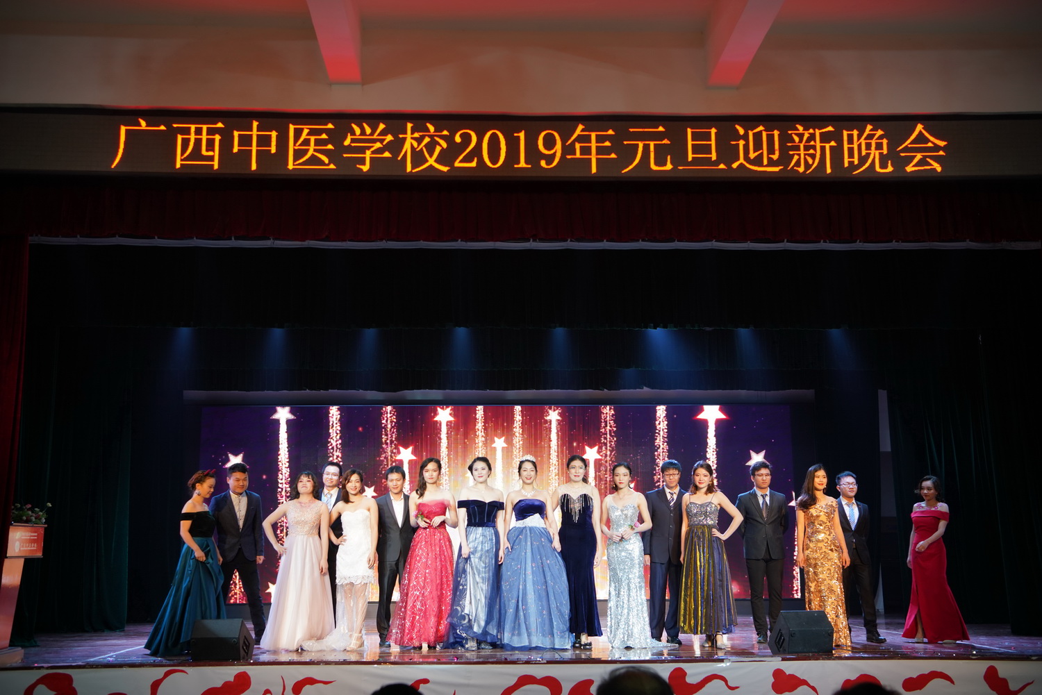 12月25日晚,广西中医学校2019年元旦迎新晚会在北湖校区隆重举行。学校校长刘竑清,党委书记蒋子华,纪委书记周琦,副校长林原、刘武、黄勇,全体老师以及六百多名学生代表一同观看了这场视觉盛宴。