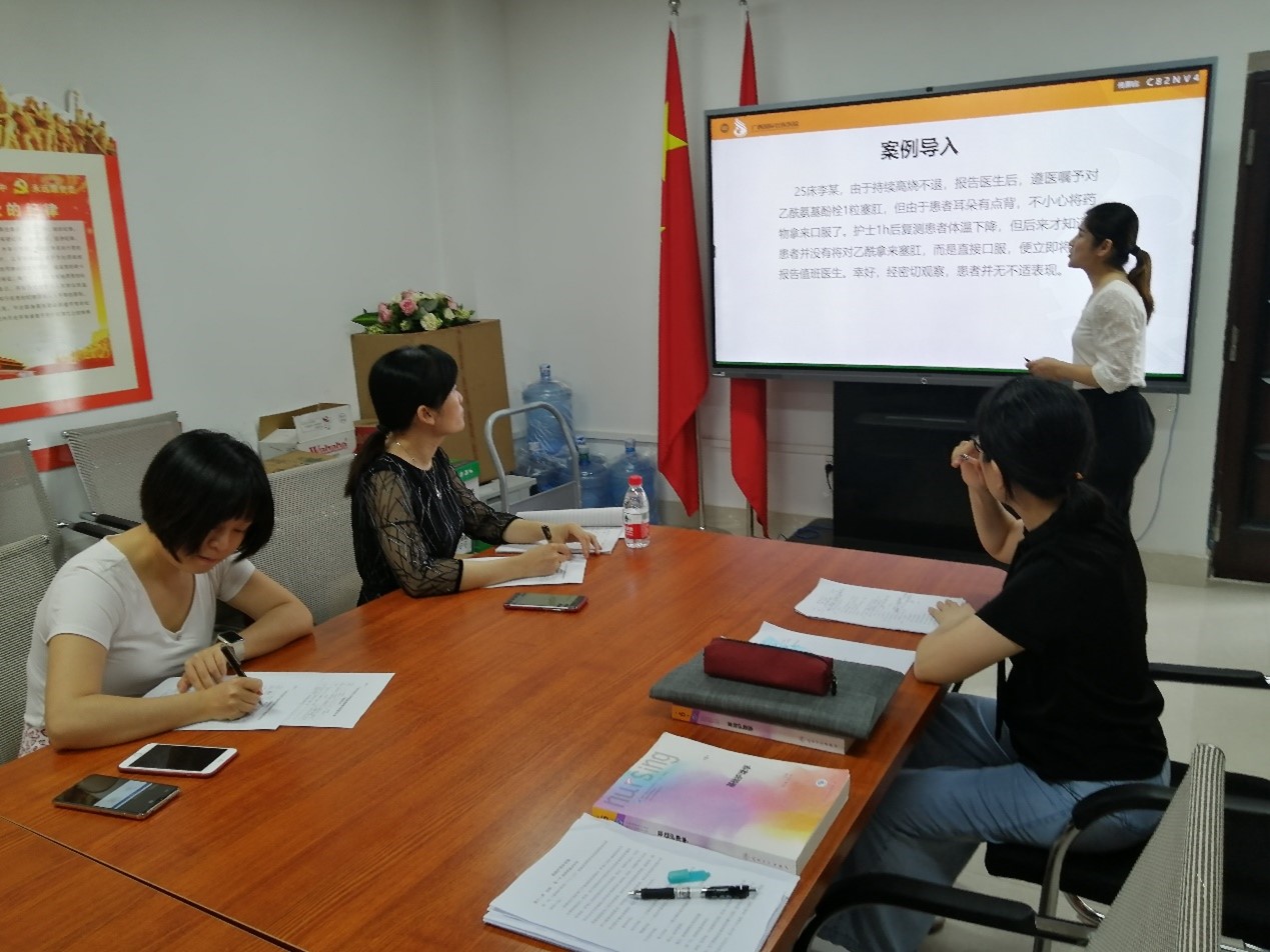 护理学基础教研室开展教研室活动 发布时间:2022-06-23 17:08:23 浏览次数: 次 【字体:小 大】 2022年6月21日下午,护理学基础教研室在自诚楼C501开展教研室活动,教研室主任兰艺主持本次活动,活动主题是临床教师新课试讲。来自广西国际壮医医院的黄美芳和周艳娜两位新教师试讲了“给药”这一章的部分内容,教研室的老师针对试讲情况提出了的意见和建议,指导新教师在教学环节应注意的问题。最后,兰主任对两位临床教师提出了二点要求:一是要充分备课,以最好的状态迎接自己的第一课;二是要学习运用现代化教学手段,提高教学水平。 黄美芳老师试讲 周艳娜老师试讲 分享到: 【打印正文】