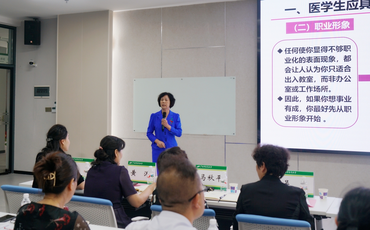 接着,杨连招给同学们作“新时代医学生职业素养与职业发展”专题讲座。她立足护理学科专业特色,明晰了医学生应具备的基本素养,分析了医学生就业的现状,提出了在新时代下医学生要如何培育职业素养,助力同学们更好进行职业规划。她还结合自己在工作生活中感悟,提出医学生应该加强以“爱”与“感恩”为核心的人文精神培养。