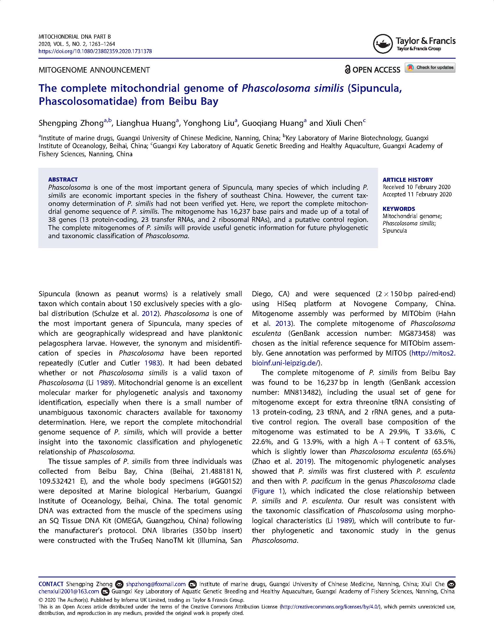 2020-The complete mitochondrial genome of Phascolosoma similis Sipuncula Phascolosomatidae from Beibu Bay 发布时间:2020-10-21 16:32:18 浏览次数: 次 【字体:小 大】 分享到: 【打印正文】