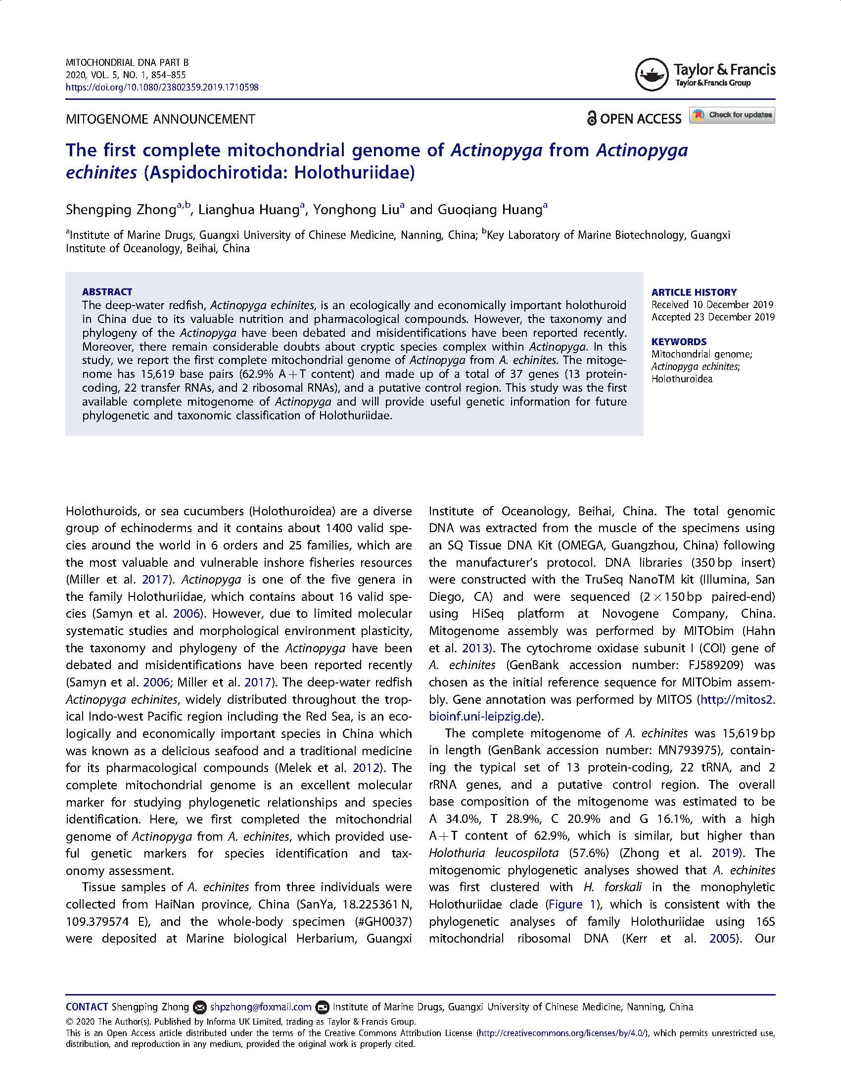 2020-The first complete mitochondrial genome of Actinopyga from Actinopyga echinites Aspidochirotida Holothuriidae 发布时间:2020-10-21 16:35:06 浏览次数: 次 【字体:小 大】 分享到: 【打印正文】