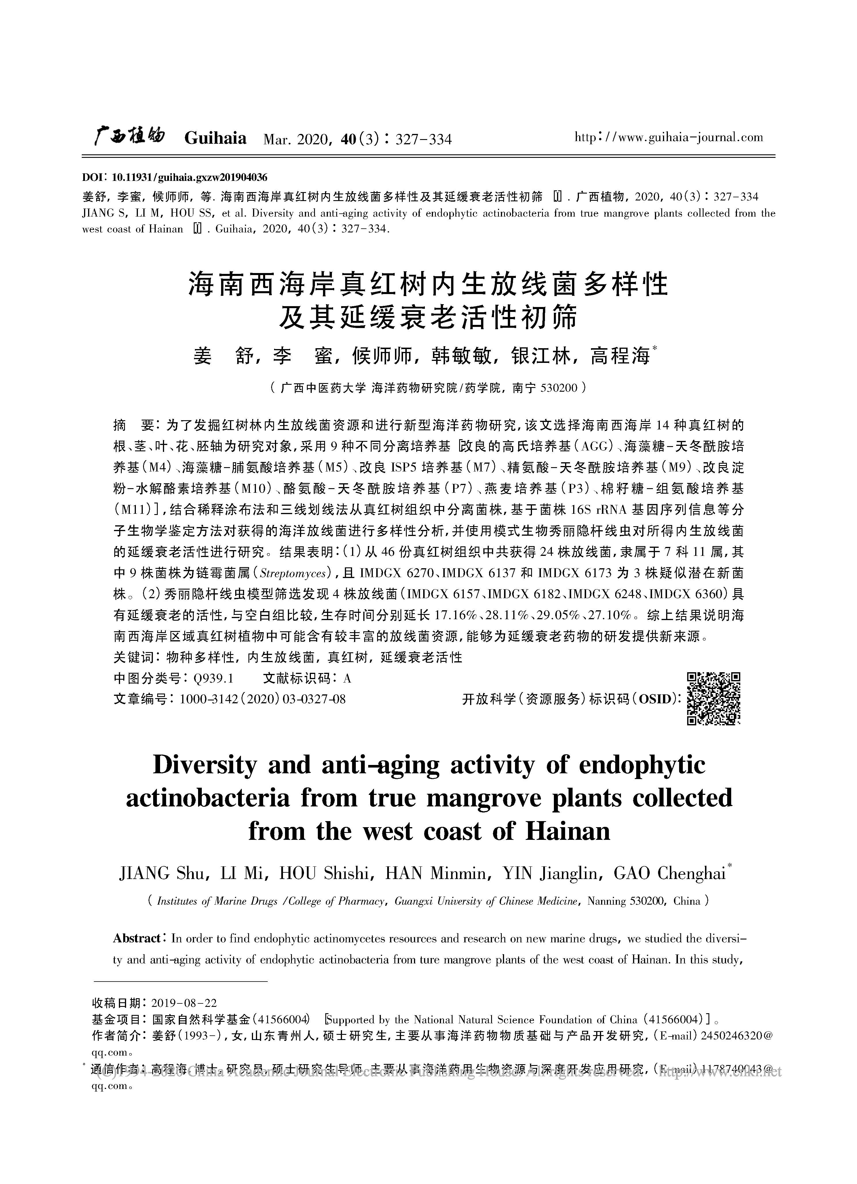 2020-海南西海岸真红树内生放线菌多样性及其延缓衰老活性初筛