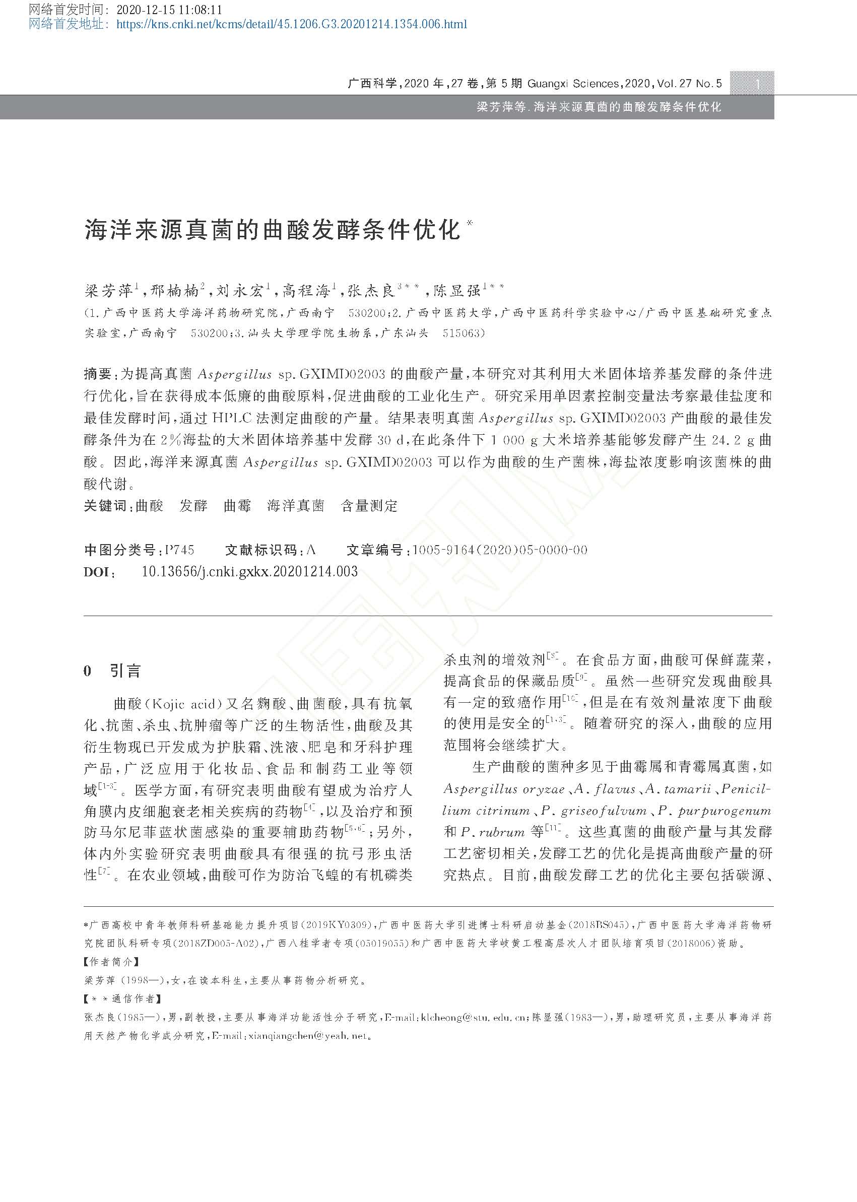 2020-海洋来源真菌的曲酸发酵条件优化