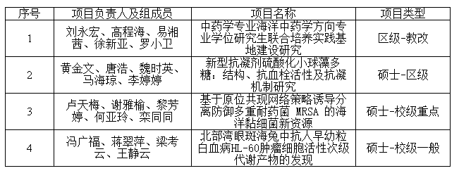 2022年海洋药物研究院研究生教育创新计划项目获四项资助 作者:qrc 发布时间:2022-01-04 17:31:39 浏览次数: 次 【字体:小 大】 2022年海洋药物研究院研究生教育创新计划项目获四项资助各位老师、研究生: 根据自治区学位委员会《关于申报2022年广西研究生教育创新计划项目的通知》(桂学位〔2021〕12号)文件精神,经各有关培养单位严格评选推荐,研究生院组织专家评审,点点体育2022年研究生教育创新计划项目申报工作已圆满完成,其中我院共获得四项资助,详见下表: 分享到: 【打印正文】