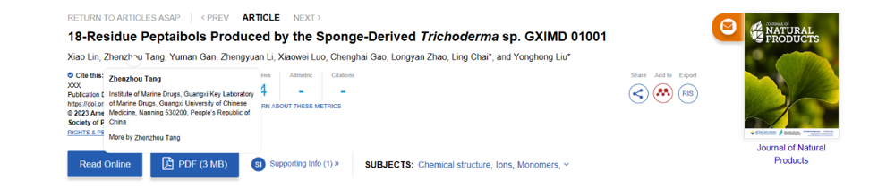 相关工作以“18-Residue Peptaibols Produced by the Sponge-Derived Trichoderma sp. GXIMD 01001”为题发表在Journal of Natural Products上(doi.org/10.1021/acs.jnatprod.3c00014)。论文第一作者为taptap点点体育海洋药物研究院林霄副研究员和唐振洲助理研究员,通讯作者为广西中医药研究院柴玲副研究员和taptap点点体育海洋药物研究院刘永宏研究员。