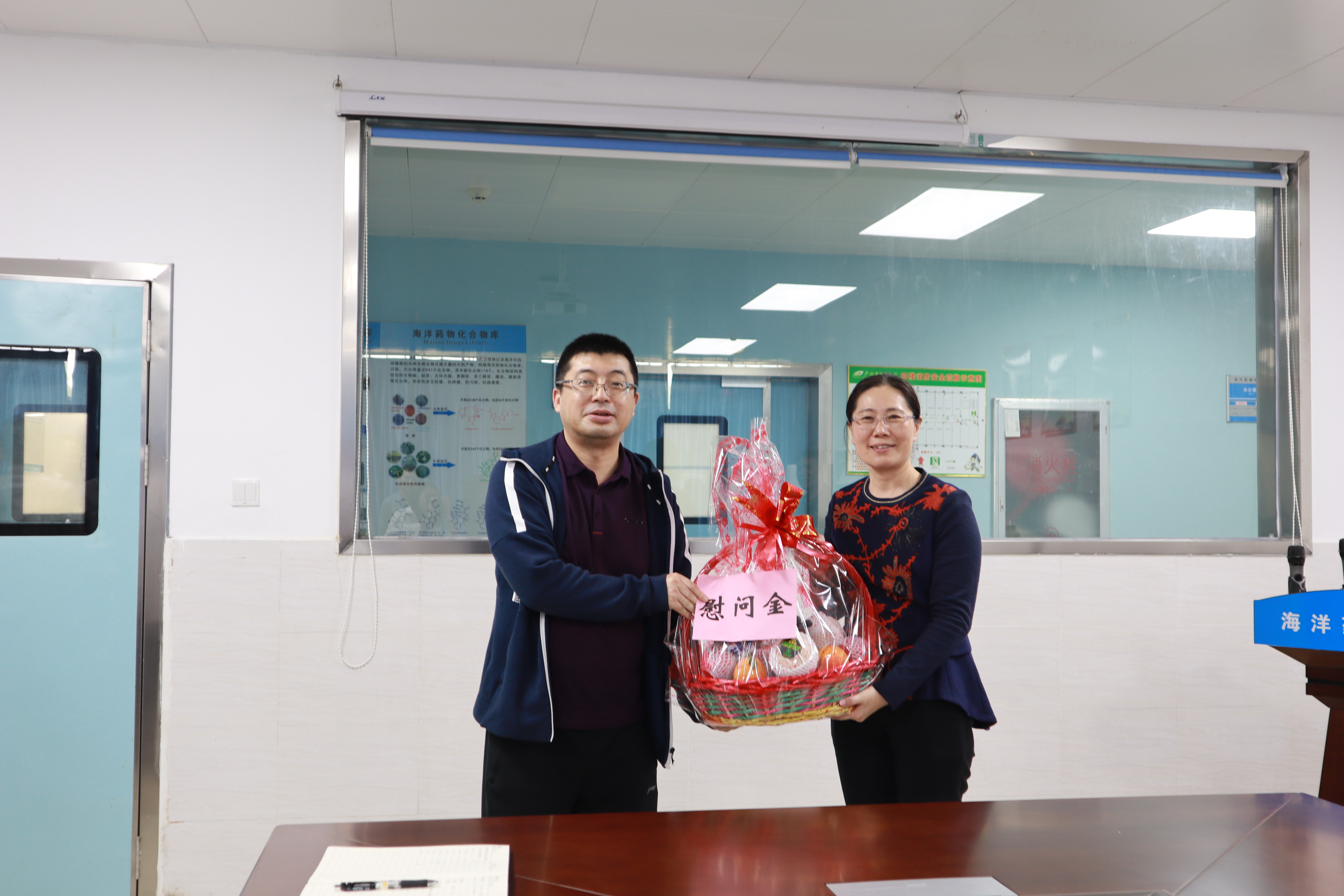 在仙葫校区致知楼海洋药物研究院D410会议室,冷副校长询问了刘永宏研究员当前的工作和生活情况,详细了解他在taptap点点体育的工作进展和成果,并且与刘永宏团队成员进行亲切交谈,感谢他们为学校的建设和发展作出的积极贡献,希望他们在新的一年再接再厉,为学校再立新功。冷副校长送上水果篮和慰问金,向刘永宏研究员致以衷心的祝愿和新春祝福。
