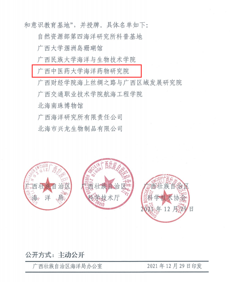【喜讯】海洋药物研究院荣获首批“广西海洋科普和意识教育基地”授牌 发布时间:2022-01-05 11:54:39 浏览次数: 次 【字体:小 大】 http://hyj.gxzf.gov.cn/zwgk_66846/tzgg/t11075305.shtml 分享到: 【打印正文】