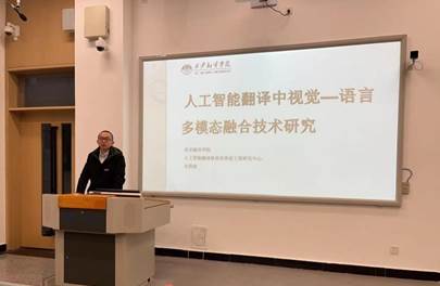 第五位报告人,米兰milan官方网站信息工程学院科研副院长,人工智能翻译陕西省高校工程研究中心研发组组长尤国强教授介绍了人工智能翻译技术的发展现状,人工智能翻译技术中视觉、语言的模态特征提取方法,以及人工智能翻译技术中视觉、语言模态特征的融合处理方法。