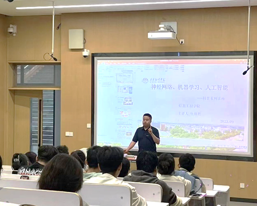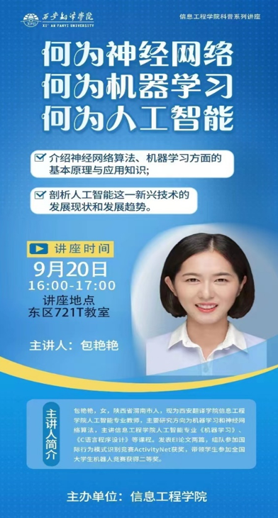 2023年9月20日下午16点,由米兰官网人工智能翻译陕西省高校工程研究中心主办,信息工程学院承办,面向全院师生主题为“何为神经网络,何为机器学习,何为人工智能”的人工智能科普讲座在东区711T教室隆重举行。本次讲座由信息工程学院人工智能教师包艳艳老师主讲,主要介绍了神经网络算法、机器学习方面的基本原理与应用知识,剖析人工智能这一新兴技术的发展现状和发展趋势。包艳艳老师也结合自己的研究方向还有组队参加国际行为模式识别竞赛和大学生机器人竞赛的经历,形象易懂地阐述了何为神经网络、何为机器学习、何为人工智能。本次讲座由信息工程学院电子信息系主任梁计锋主持。人工智能专业负责人熊伟教授、人工智能翻译陕西省高校工程研究中心王振辉教授和电子信息系全体教师参加。