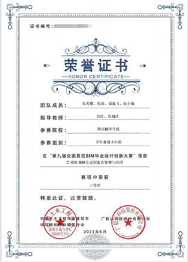 由中国土木工程学会建筑市场与招标投标研究分会和广联达科技股份有限公司主办,东南大学、华南理工大学、北京交通大学和北京建筑大学联合承办的“第九届全国高校BIM毕业设计创新大赛”全国赛已落下帷幕,大赛闭幕式暨颁奖典礼于2023年6月4日上午在北京建筑大学大兴校区举行。在校领导和院领导的鼓励和支持下,由信息工程学院侯红老师、段越洋老师带队的KTZ小队(朱兆耀、张颖、梁逸飞、阮小瑞),在本次比赛中获得了国家三等奖的好成绩。
