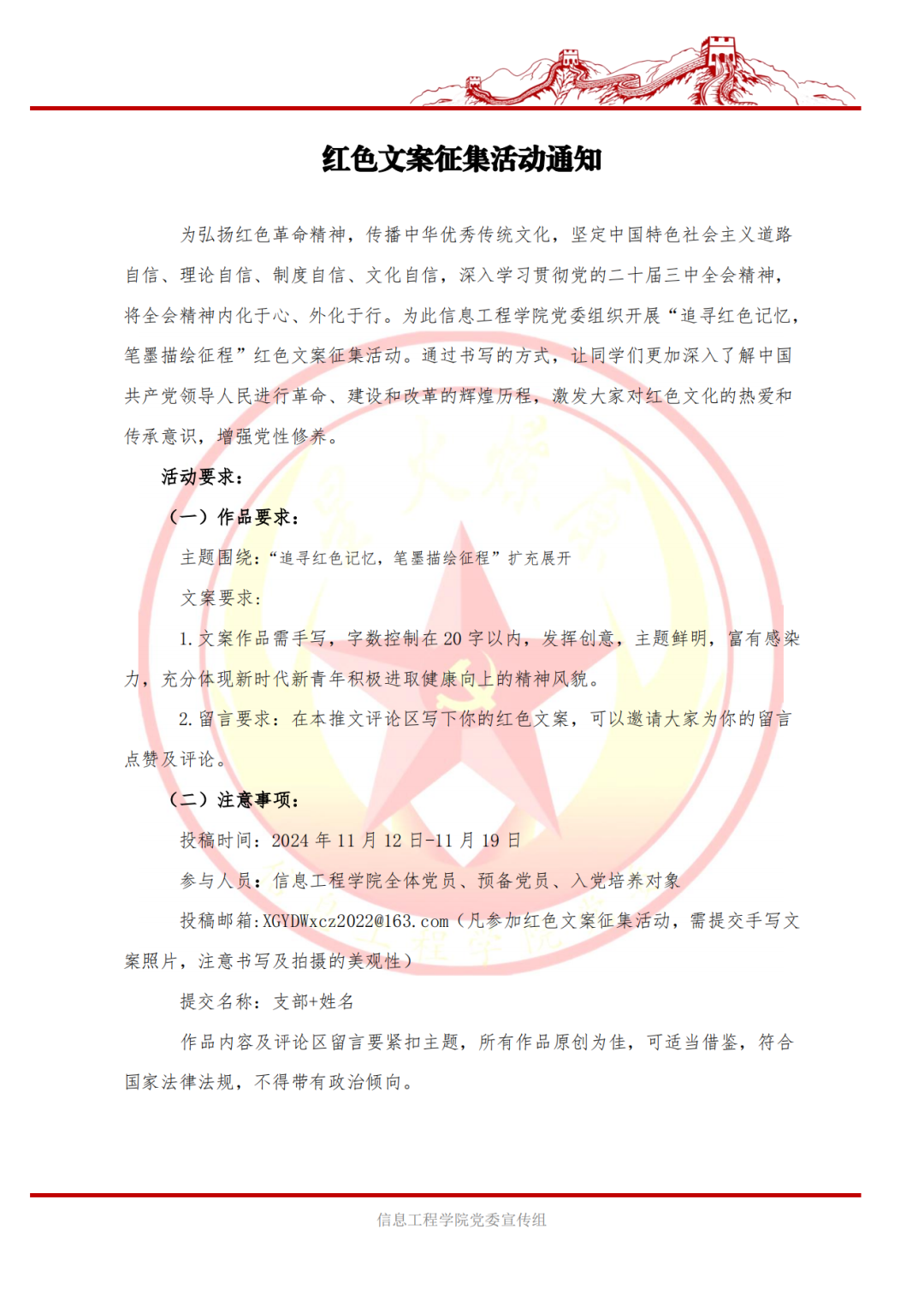为弘扬红色革命精神,传播中华优秀传统文化,坚定中国特色社会主义道路自信、理论自信、制度自信、文化自信,深入学习贯彻党的二十届三中全会精神,将全会精神内化于心、外化于行。为此信息工程学院党委组织开展“追寻红色记忆,笔墨描绘征程”红色文案征集活动。通过书写的方式,让同学们更加深入了解中国共产党领导人民进行革命、建设和改革的辉煌历程,激发大家对红色文化的热爱和传承意识,增强党性修养。