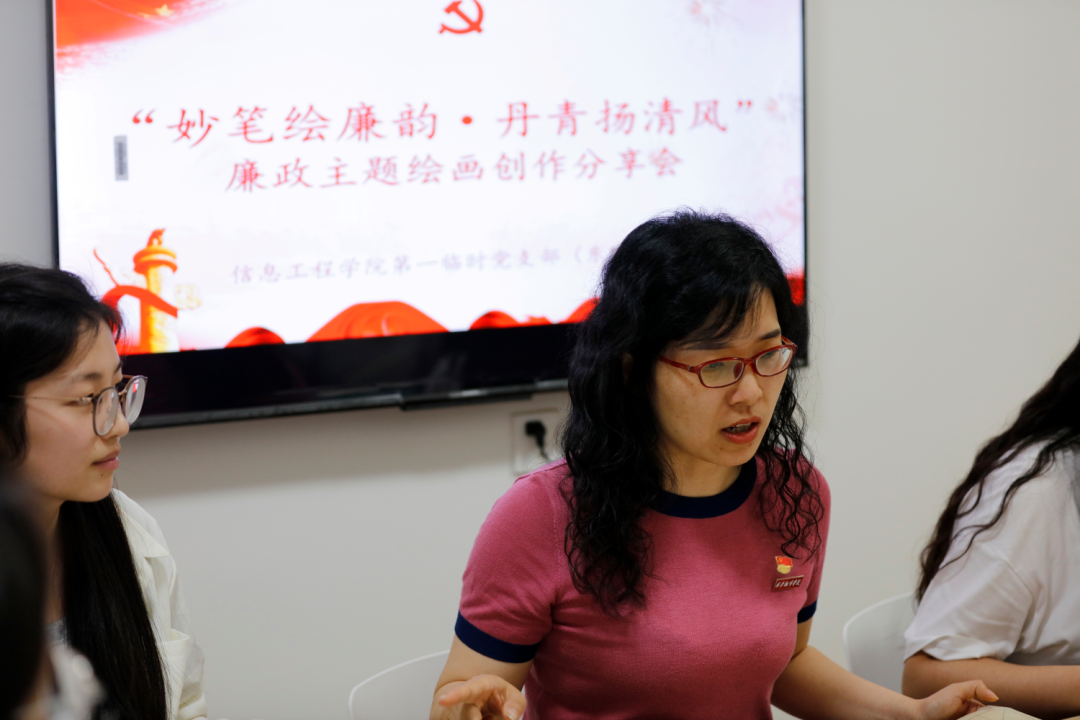 为进一步深化廉洁文化教育,强化学生党员的纪律意识与廉洁自律观念,创新廉洁教育形式,营造风清气正的校园环境,引领青年学生感悟廉洁文化的深刻内涵,筑牢拒腐防变的思想防线。信息工程学院第一临时党支部开展“妙笔绘廉韵·丹青扬清风”廉政主题绘画创作分享会。本次活动由第一临时党支部书记沈平利主持,东十五、十六公寓全体支部成员参加。