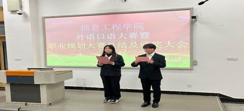 12月14日晚,信息工程学院外语口语大赛暨职业规划大赛总结及颁奖大会在722T顺利举行。信息工程学院党委书记、副院长赵桢宇、学工办主任王晓东、团总支书记王荣平、辅导员陈雨婷、李卫刚、关顺红应邀出席,获奖选手及100余名学生代表参加了大会。