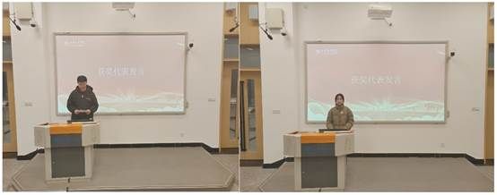 高永博与王定红分别作为外语口语大赛与职业规划比赛获奖代表进行了发言。他们非常感谢本次比赛给了自己展示的平台,并在整个比赛中发现了自身的不足方面,也从其他选手身上学到了许多。他们相信,只要坚持向着自己的目标不断努力,就一定能够获得成功。